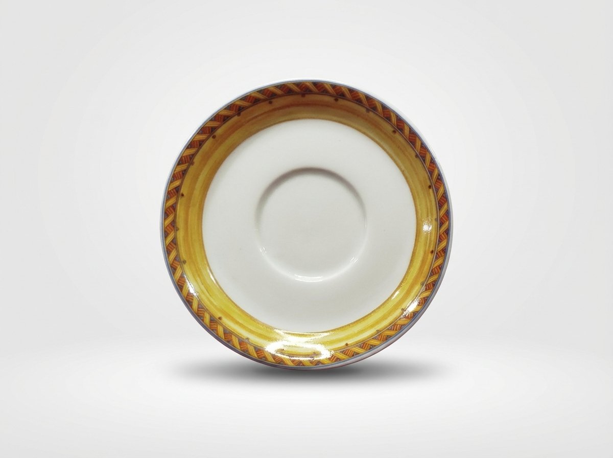 Ši kompaktiška geltonai dekoruota lėkštutė puikiai tinka kavos ar arbatos puodeliui padėti. Ryškus geltonas kraštelis su raštu suteikia stalui žaismingumo ir šilumos pojūtį.