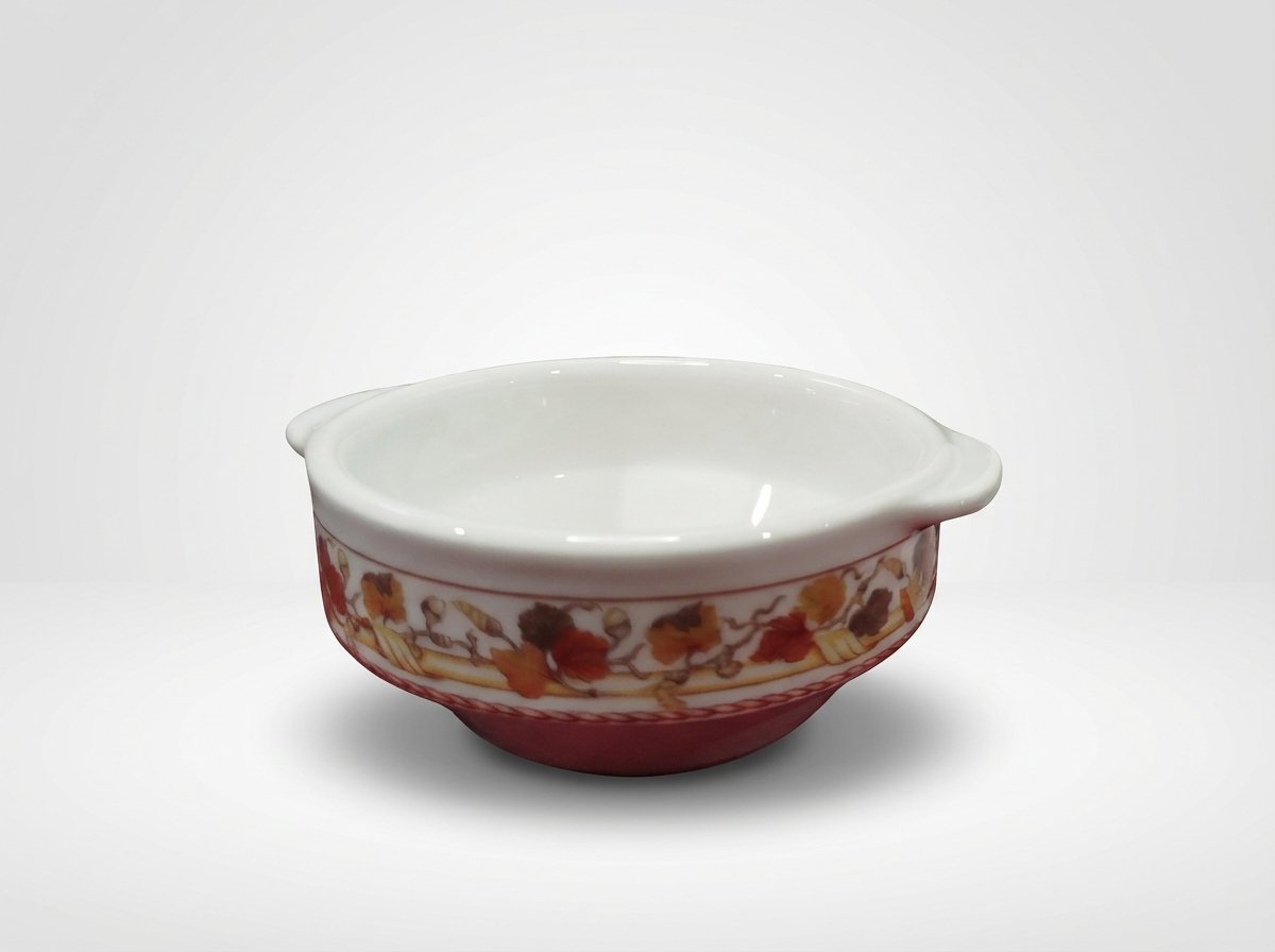 Dubenėlė dekoruota rudens lapų ir augalų motyvais, suteikiančiais jaukumo ir šilumos pojūtį stalui. Lygi balta vidaus dalis leidžia gražiai išryškėti patiekiamo maisto spalvoms.
