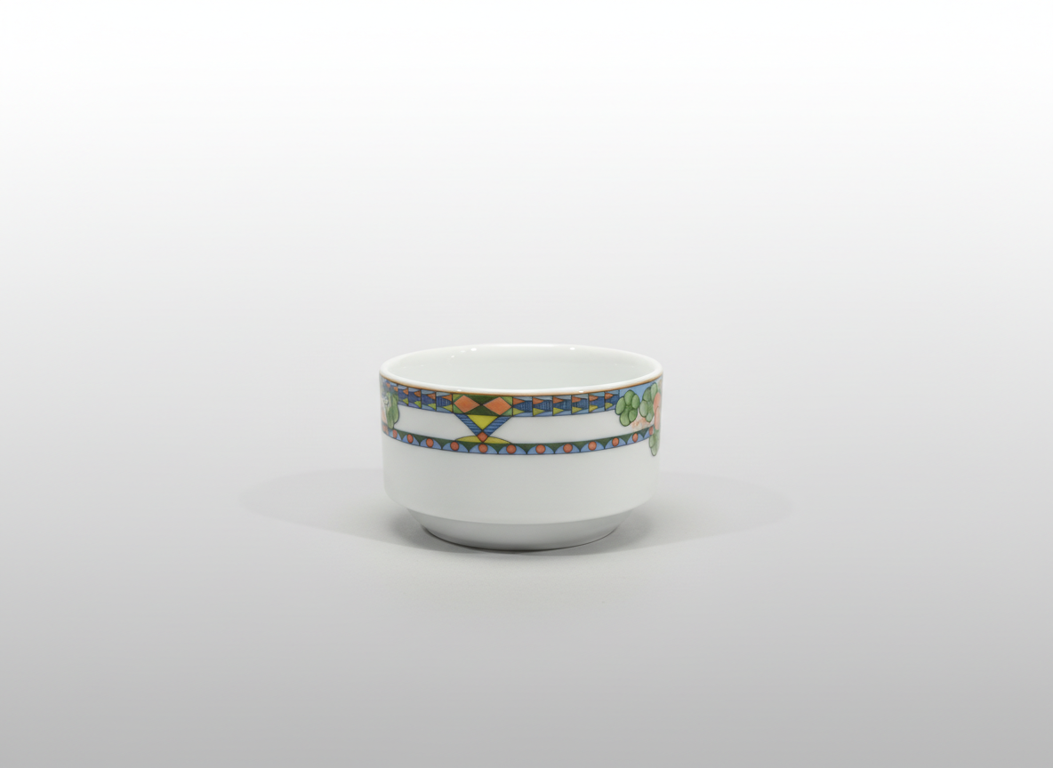 Spalvotas geometrinis ornamentas išoriniame paviršiuje suteikia dubenėliui žaismingumo ir išskirtinumo, todėl jis lengvai dera tiek prie klasikinių, tiek prie ryškesnių stalo serviruočių.