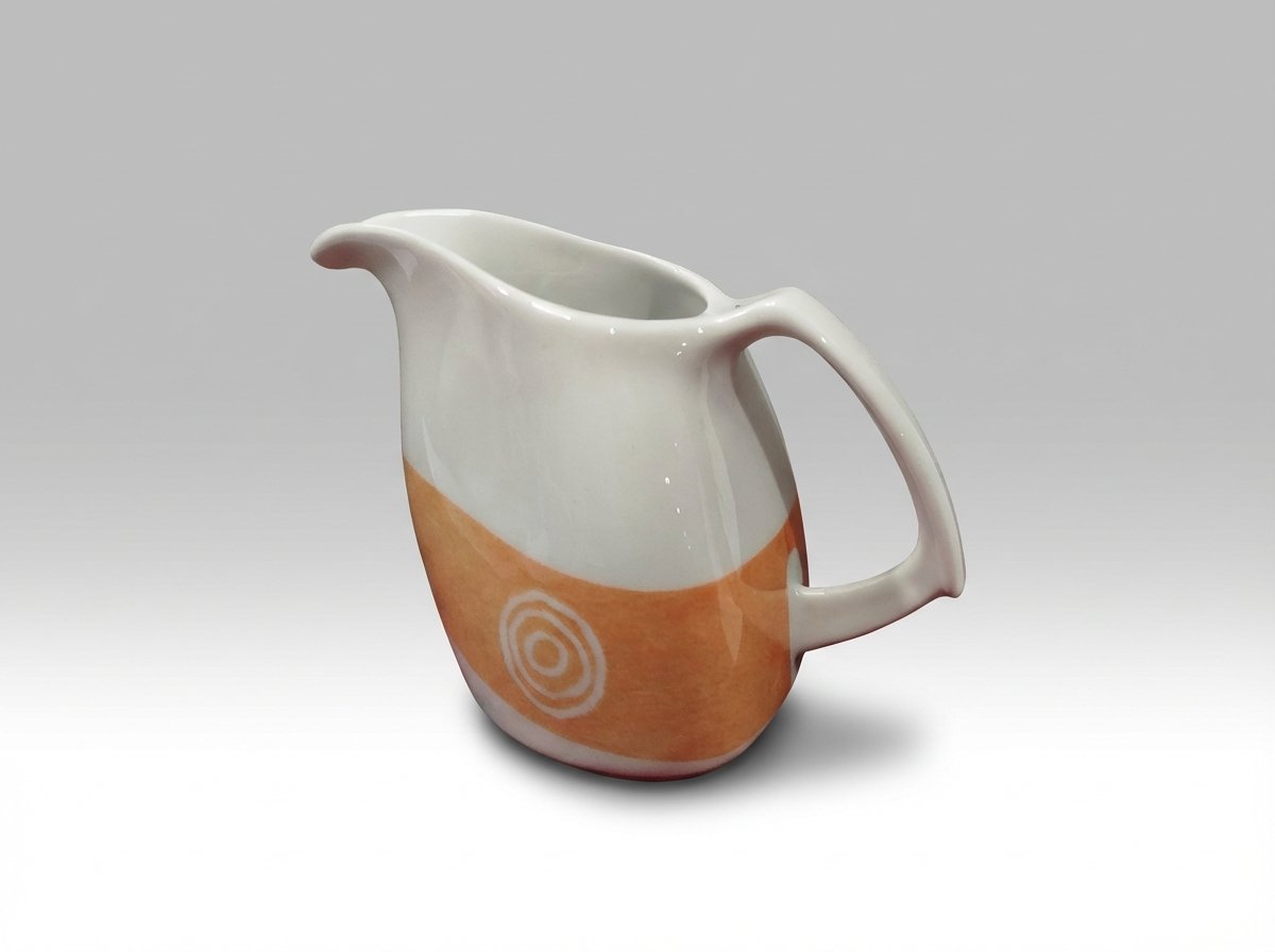 Oranžinė dekoratyvinė juosta su subtiliu ornamentu suteikia indui žaismingumo ir pagyvina stalo serviravimą. Kompaktiški matmenys – apie 9 cm aukštis ir 6 cm plotis – leidžia ąsotėlį lengvai derinti su kitais indais ir stalo prekėmis.