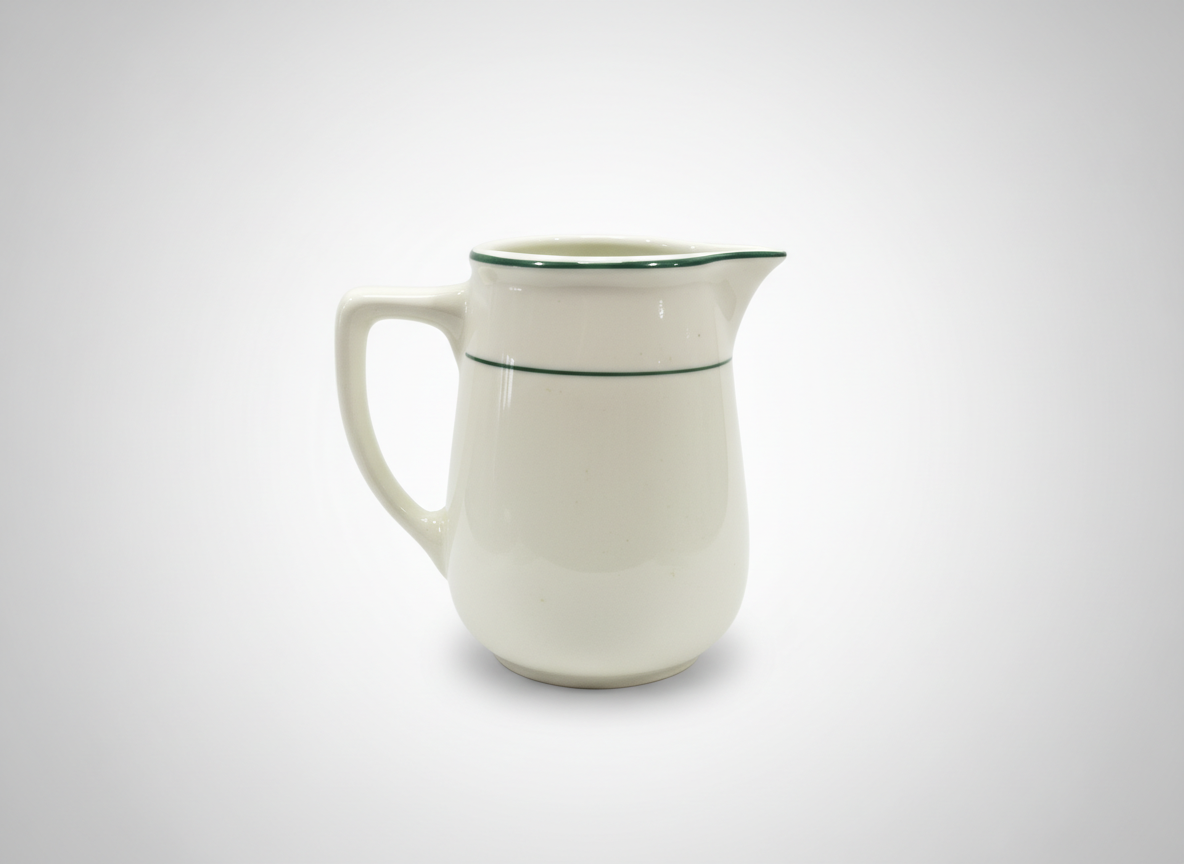 Stilingas baltas keraminis grietinėlės ąsotėlis su subtilia žalia juostele viršuje. Puikiai tinka patogiam pieno ar grietinėlės patiekimui prie kavos ir arbatos, kasdieniam naudojimui ar šventiniam stalui.
