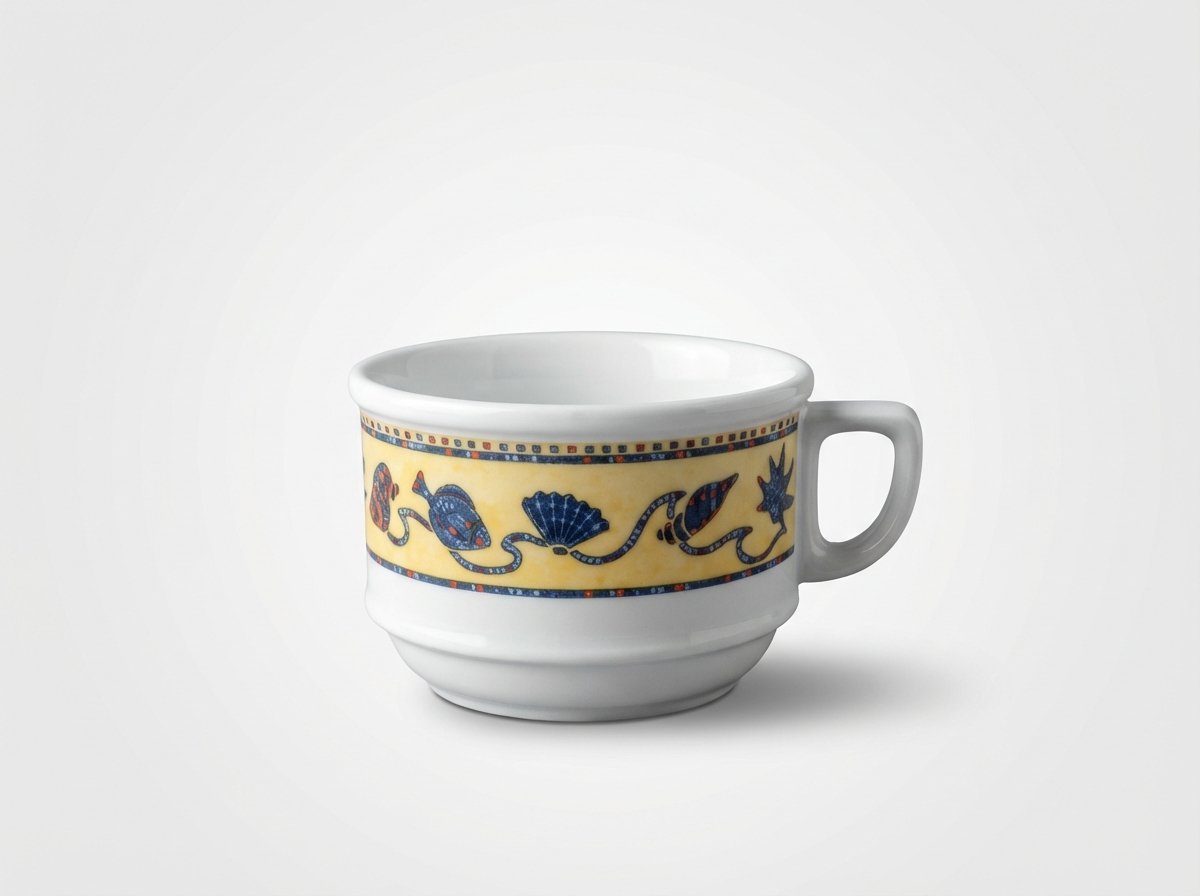 Puodelio išorę puošia dekoratyvinė juostelė su raštais, kuri suteikia indui išskirtinį ir jaukų stilių. Tokį puodelį galima derinti su kitais indais ir stalo prekėmis, sukuriant vieningą stalo serviravimo stilių.