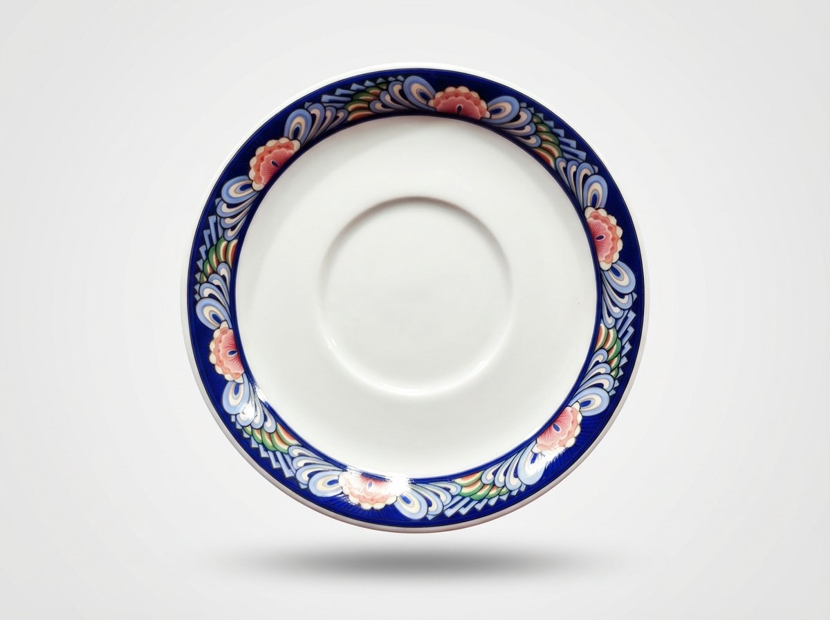 Nuotraukoje matoma klasikinė balta lėkštė su ryškiu, ornamentuotu mėlynu kraštu ir gėlių motyvais. Tai kompaktiško dydžio lėkštė, tinkanti kasdieniam naudojimui ir stalo serviravimui.
