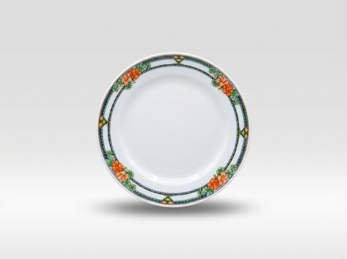 Universali apvali lėkštė 18 cm skersmens su spalvingu gėlėtu kraštu – praktiškas ir estetiškas pasirinkimas kasdieniam stalo serviravimui.