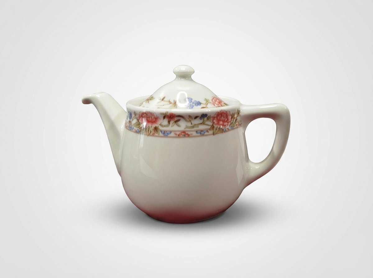 Šis arbatinukas pagamintas iš šviesios spalvos medžiagos su dekoratyvine gėlių juostele viršuje. Klasikinė forma ir patogi rankena leidžia patogiai pilti arbatą, o nuimamas dangtelis užtikrina lengvą pripildymą ir plovimą.