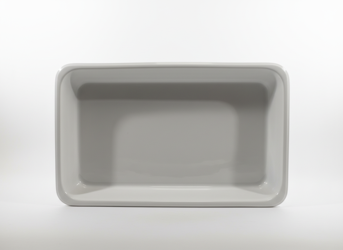 Didelė, stačiakampė balta lėkštė, tinkanti tiek kasdieniam naudojimui, tiek patogiam užkandžių ar karštų patiekalų pateikimui ant stalo.
